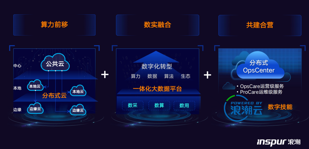 在这个过程中,浪潮云以powered by的模式打造行业的数字底座,通过大数据平台,融合数据云,实现数实融合、一个基座,结合生态伙伴、行业伙伴,实现行业云的共建合营,通过浪潮云的技术加上行业经验,构建行业的数字底座。