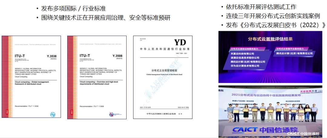 中国信通院积极推动构建分布式云服务标准体系,并完成分布式云基础设施、分布式云容器平台、分布式云全局管理、分布式云全域调度标准编制。