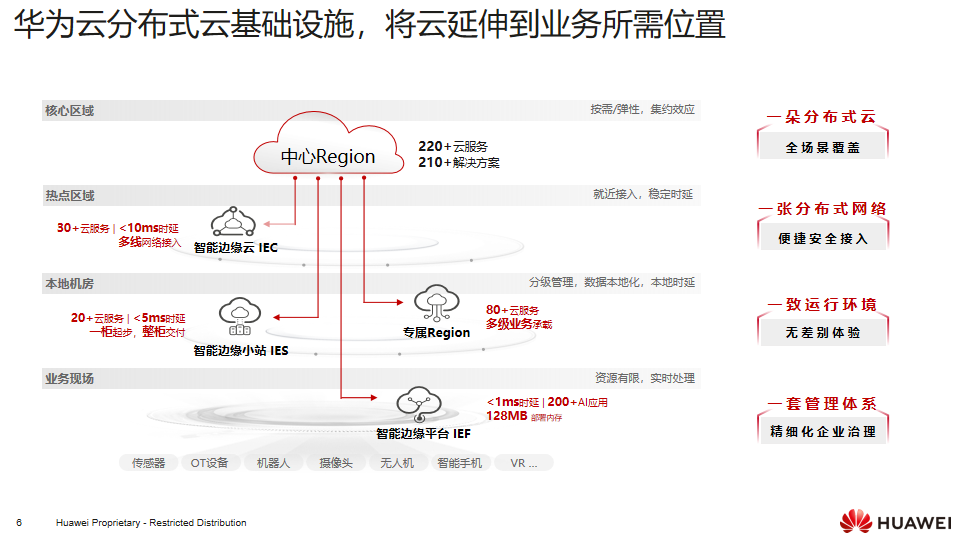 华为云分布式云基础设施,将华为云能力延伸到不同位置,为用户提供始终如一的云服务体验。在分布式云的体系下,华为云按四个一的理念打造产品矩阵,即: