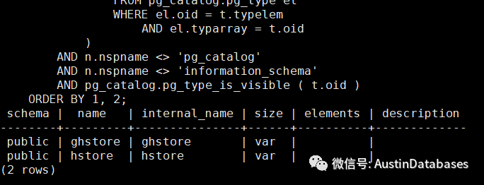 SELECT n.nspname AS schema, pg_catalog.format_type ( t.oid, NULL ) AS name, t.typname AS internal_name, CASE WHEN t.typrelid != 0 THEN CAST ( 'tuple' AS pg_catalog.text ) WHEN t.typlen < 0 THEN CAST ( 'var' AS pg_catalog.text ) ELSE CAST ( t.typlen AS pg_catalog.text ) END AS size, pg_catalog.array_to_string ( ARRAY( SELECT e.enumlabel FROM pg_catalog.pg_enum e WHERE e.enumtypid = t.oid ORDER BY e.oid ), E'\n' ) AS elements, pg_catalog.obj_description ( t.oid, 'pg_type' ) AS description FROM pg_catalog.pg_type t LEFT JOIN pg_catalog.pg_namespace n ON n.oid = t.typnamespace WHERE ( t.typrelid = 0 OR ( SELECT c.relkind = 'c' FROM pg_catalog.pg_class c WHERE c.oid = t.typrelid ) ) AND NOT EXISTS ( SELECT 1 FROM pg_catalog.pg_type el WHERE el.oid = t.typelem AND el.typarray = t.oid ) AND n.nspname <> 'pg_catalog' AND n.nspname <> 'information_schema' AND pg_catalog.pg_type_is_visible ( t.oid ) ORDER BY 1, 2;