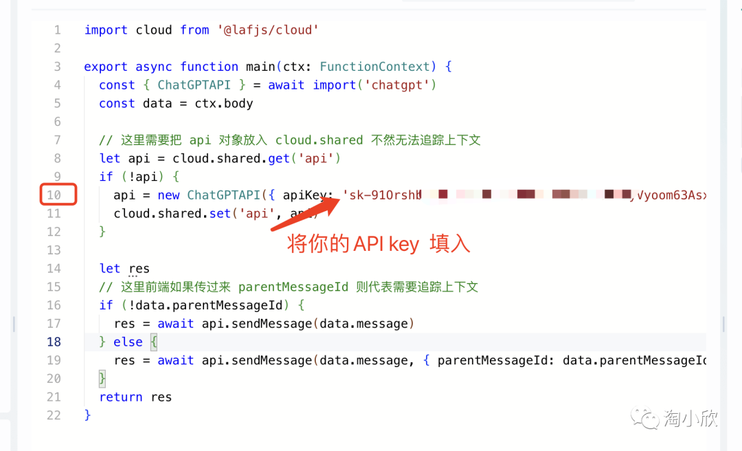 api = new ChatGPTAPI({ apiKey: "你的 api key" })