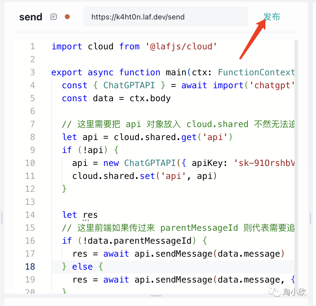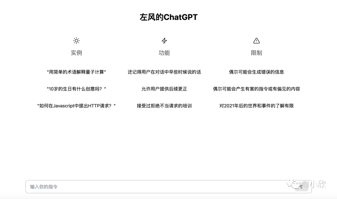 文章中使用的项目源码: https://github.com/zuoFeng59556/chatGPT 示例网站: https://jyf6wk-chat-gpt.site.laf.dev/