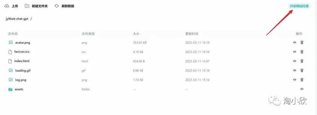 上传完毕之后,发现右上角有一个 “开启网站托管”,点一下它!