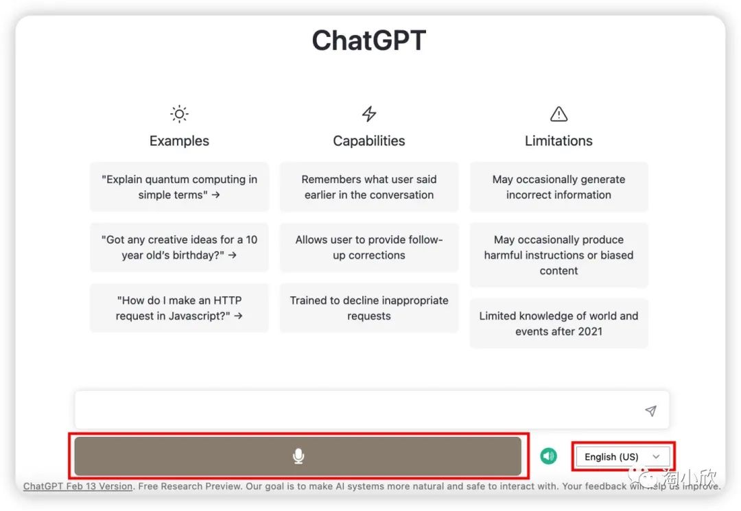 https://chat.openai.com/chat进入ChatGPT,可以看到除了输入框可以打字输入,