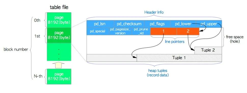 heap tuple(s) -堆元组(行)是记录数据本身。它们从页面底部开始按顺序堆叠。因为PostgreSQL需要同时了解并发控制(CC)和WAL。
