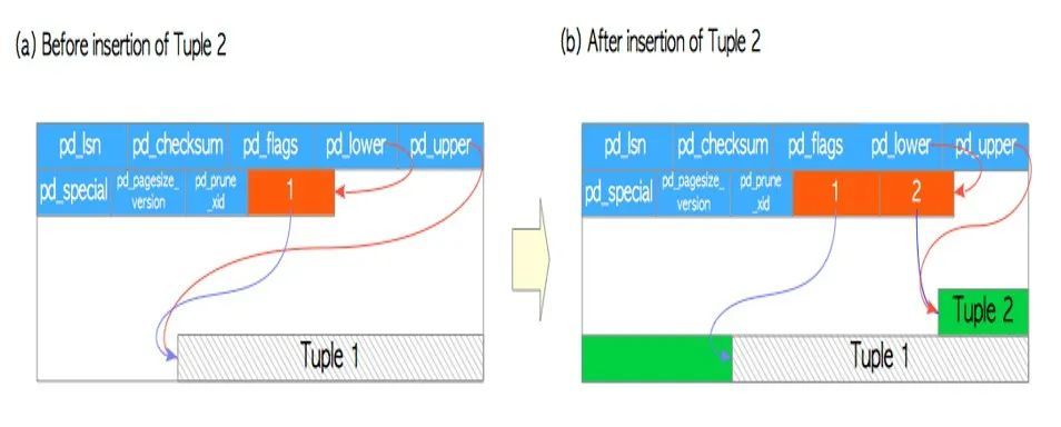 line pointer(s) -行指针为4字节长,并保存指向每个堆行的指针。它也被称为项指针。行指针形成一个简单的数组,它起到元组索引的作用。每个索引从1开始按顺序编号,称为偏移量编号。当一个新的行被添加到页面中时,一个新的行指针也被推到数组中以指向新的行
