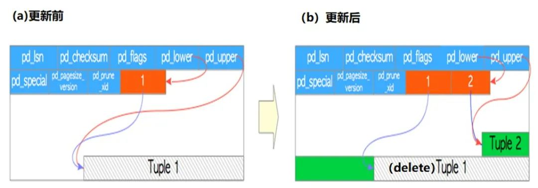 update操作时,数据库的操作过程是先delete后insert,被删除的行空间不会立刻释放,vacuum操作时会释放。