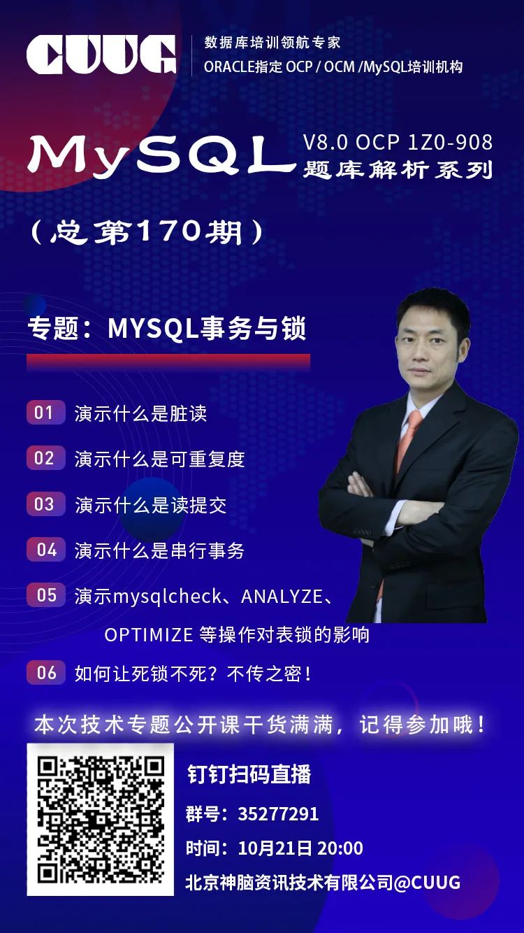今晚8点,CUUG MySQL题库解析系列(第5期,总第170期),独家讲解,欢迎参加,CUUG 认证培训放心之选。