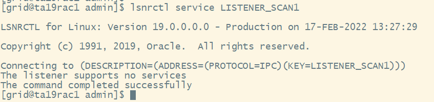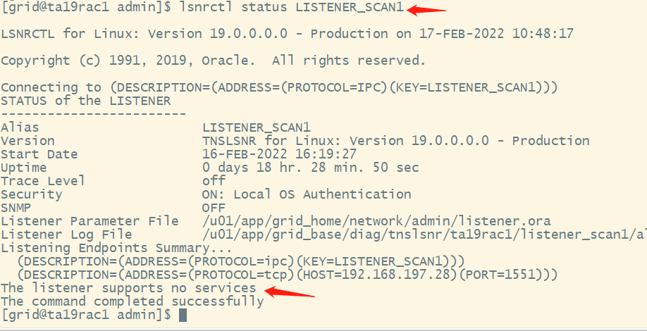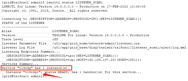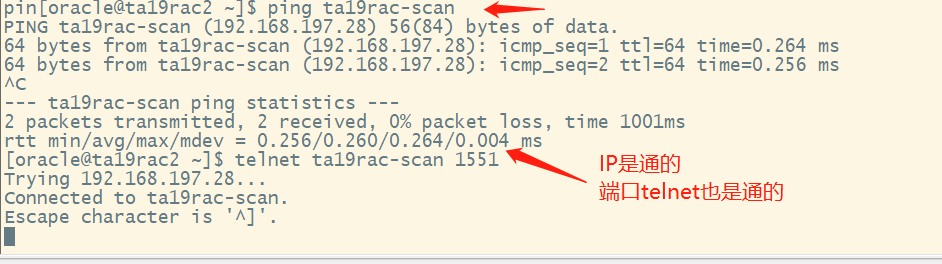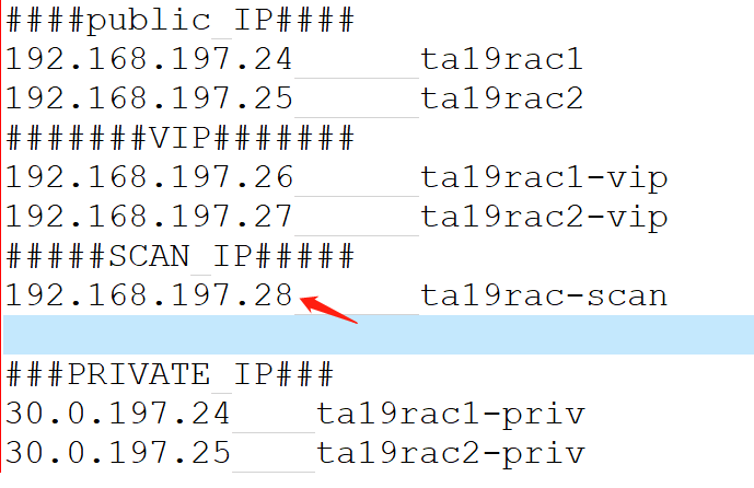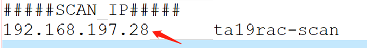 其中ta19rac-scan是主机别名,在2个节点的/etc/hosts里都对应28这个scan ip,配置是正确的!