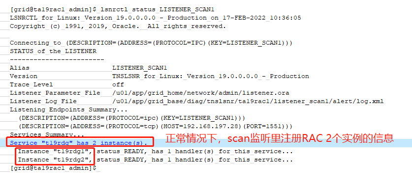 那么,现在的问题就在于,为什么两个实例都活着,都可以对外提供服务,但是SCAN监听里确只有一个节点(节点1)的注册信息呢?数据库启动或者PMON/LREG后台进程不是定期往SCAN监听去注册自己实例的信息的么?