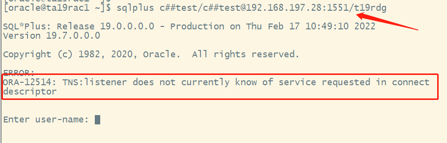 小y接下来让这位同学停掉节点1的实例,重现连接数据库ORA-12514报错,如下所示: