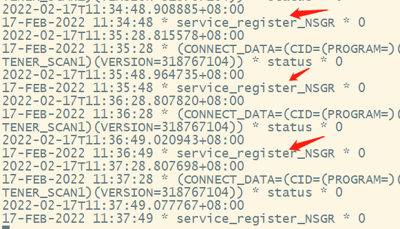 查看SCAN监听日志,发现日志里依然在定期注册,从返回码*0看,似乎是成功的,但实际没有注册进去。如下图所示。