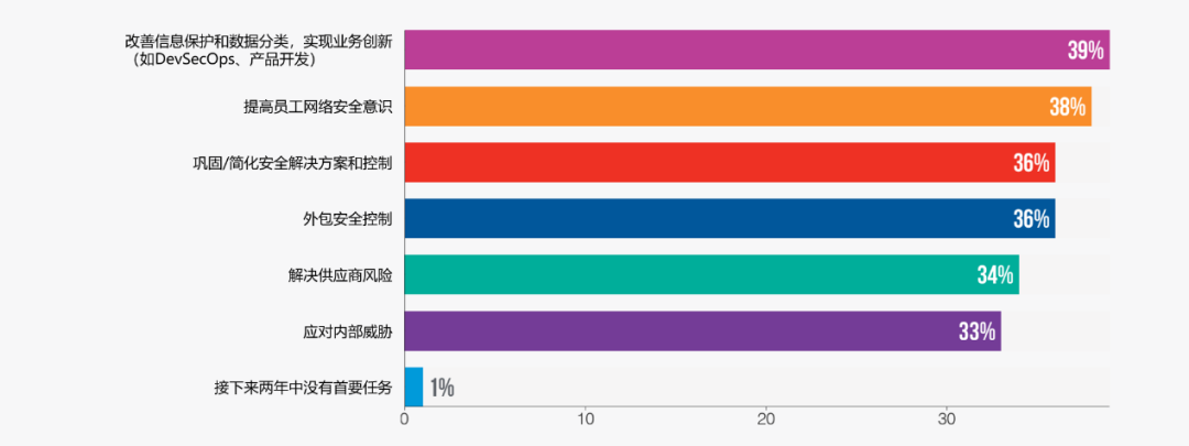 ▶ 调查结果 | 未来两年,IT安全部门的首要任务是什么?在各行各业中,改善信息保护是IT、技术、电信、金融服务、制造业和公共部门最紧迫的举措。▌总结