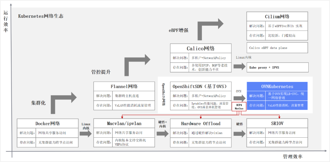 容器网络的发展,从Docker主导的CNM模型,演进到Google、CoreOS、Kubernetes主导的CNI模型。CNM与CNI并不是网络的实现,而是网络规范和网络体系。当前,容器网络CNI基本是事实的标准,除了背后开源社区的阵营不同,更多是技术迭代演进,架构优化调整。与Kubernetes在最新版本开始解耦Docker一样。下图是容器网络发展脉络,从运行效率与管理效率两个方面推动容器持续迭代优化。