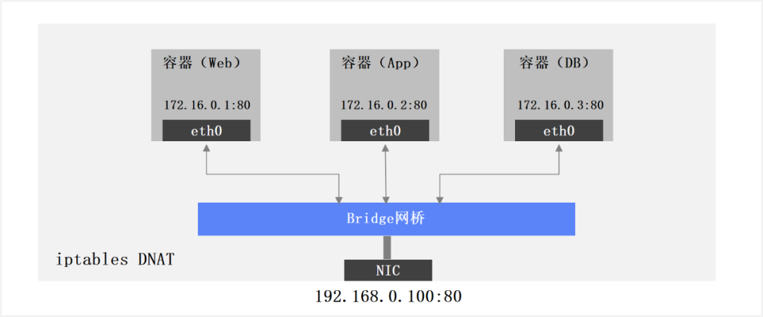 容器单节点网络,在单个容器主机,通过Bridge或者Macvlan等方式实现共享宿主机物理网卡,多个容器使用“端口映射”的方式共享容器主机IP地址。存在问题是如何进行大规模管理,容器间跨主机无需经过NAT无法直接通信。如下图所示: