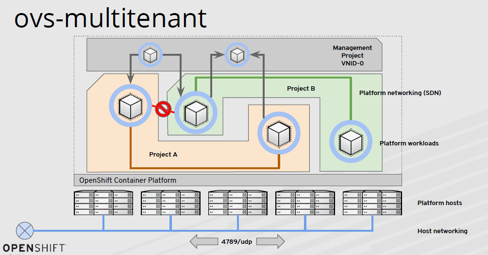 多租户 + NetworkPolicy容器网络,Openshift v3 OVS网络就是基于这个思路已经实现。通过VxLAN实现跨集群互通,使用可编程OVS流表控制每个节点上的容器流量转发控制,多租户之间的网络NetworkPolicy控制,基于Namespace级别控制,基于Pod、端口的控制。存在问题是OVS和流表依然是单机,大量的流程编程工作,SVC和LB暴露依赖iptables,性能开销较大,如下图所示。