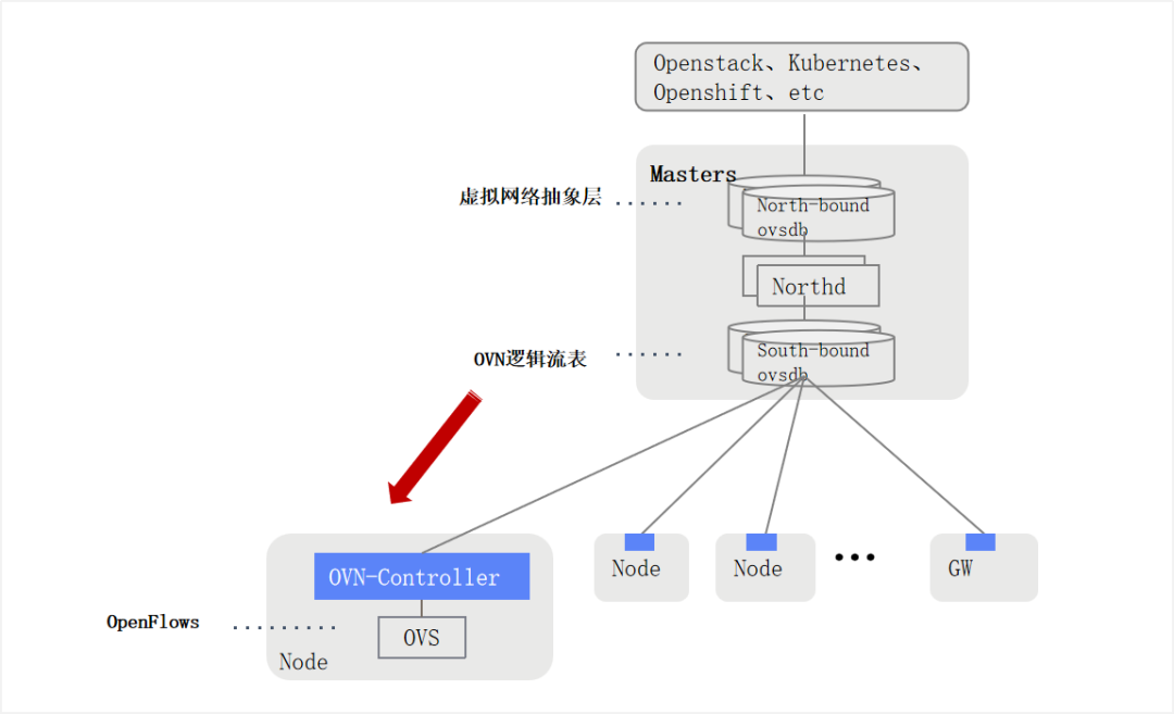 OVN是从OVS发展演进而来,是openvSwitch原生控制层实现,用于将分布式的openvSwitch交换机统一管理。OVN是集中式SDN控制器,实现集群层面做网络编排,管理组件高可用,使用OpenFlow控制协议,利用OVS实现网络转发。