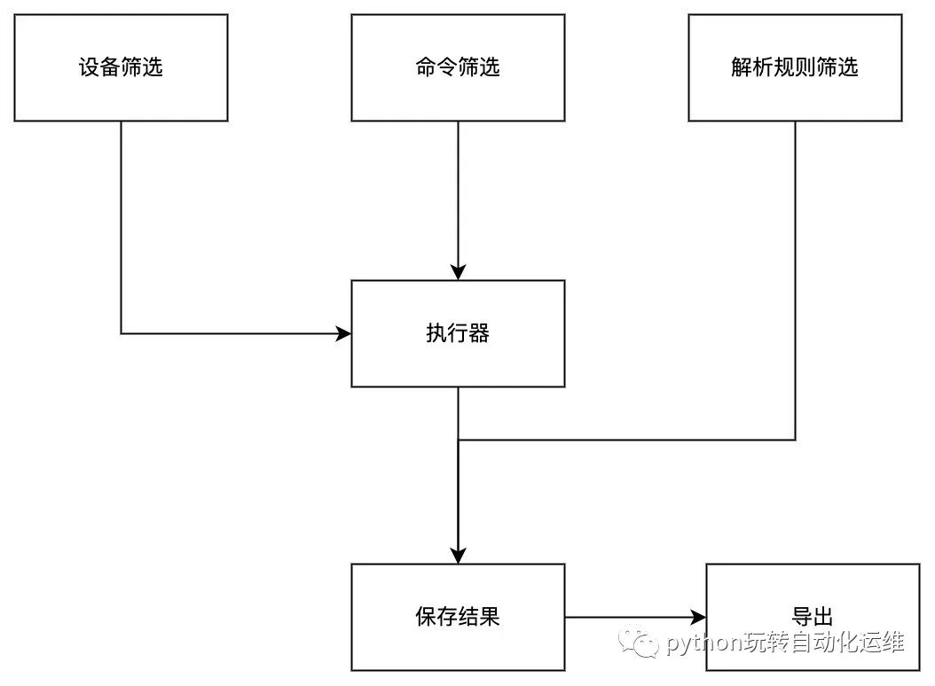 整个巡检工具中最为关键的就是执行器,我们需要实现一个封装好的执行器对象,这个对象对外暴露参数以供其他模块传入;并且它是一个较为抽象的对象,并不是单指通过SSH方式来执行操作,也可以是以API的形式调用厂商API,或者以Netconf的方式对设备进行相应的操作。