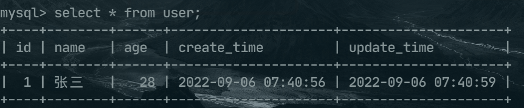 INSERT INTO `user` VALUES (1, '张三', 28, '2022-09-06 07:40:56', '2022-09-06 07:40:59');