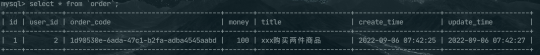 INSERT INTO `order` VALUES (1, 2, '1d90530e-6ada-47c1-b2fa-adba4545aabd', 100, 'xxx购买两件商品', '2022-09-06 07:42:25', '2022-09-06 07:42:27');