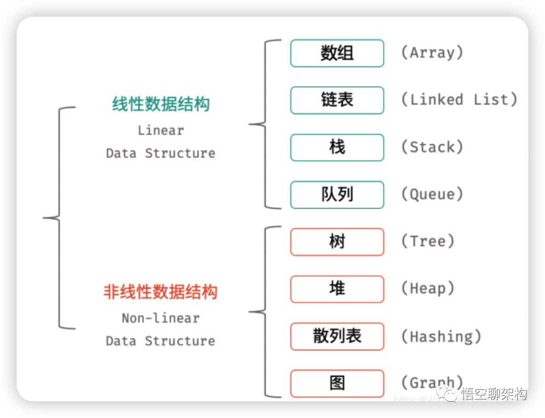 数据结构按线性和非线性分为两大类,八大种,比如线性数据结构的就有 数组、链表、栈、队列。