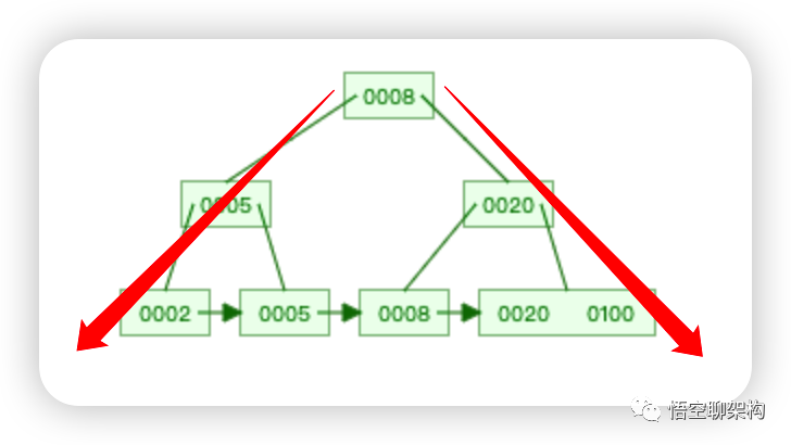那 MySQL 中的索引是其中哪一种呢?它是一种树型数据结构,而且是 B+ 树,如下图所示,不过图中的树是一种倒着的树,它的根在最上面。