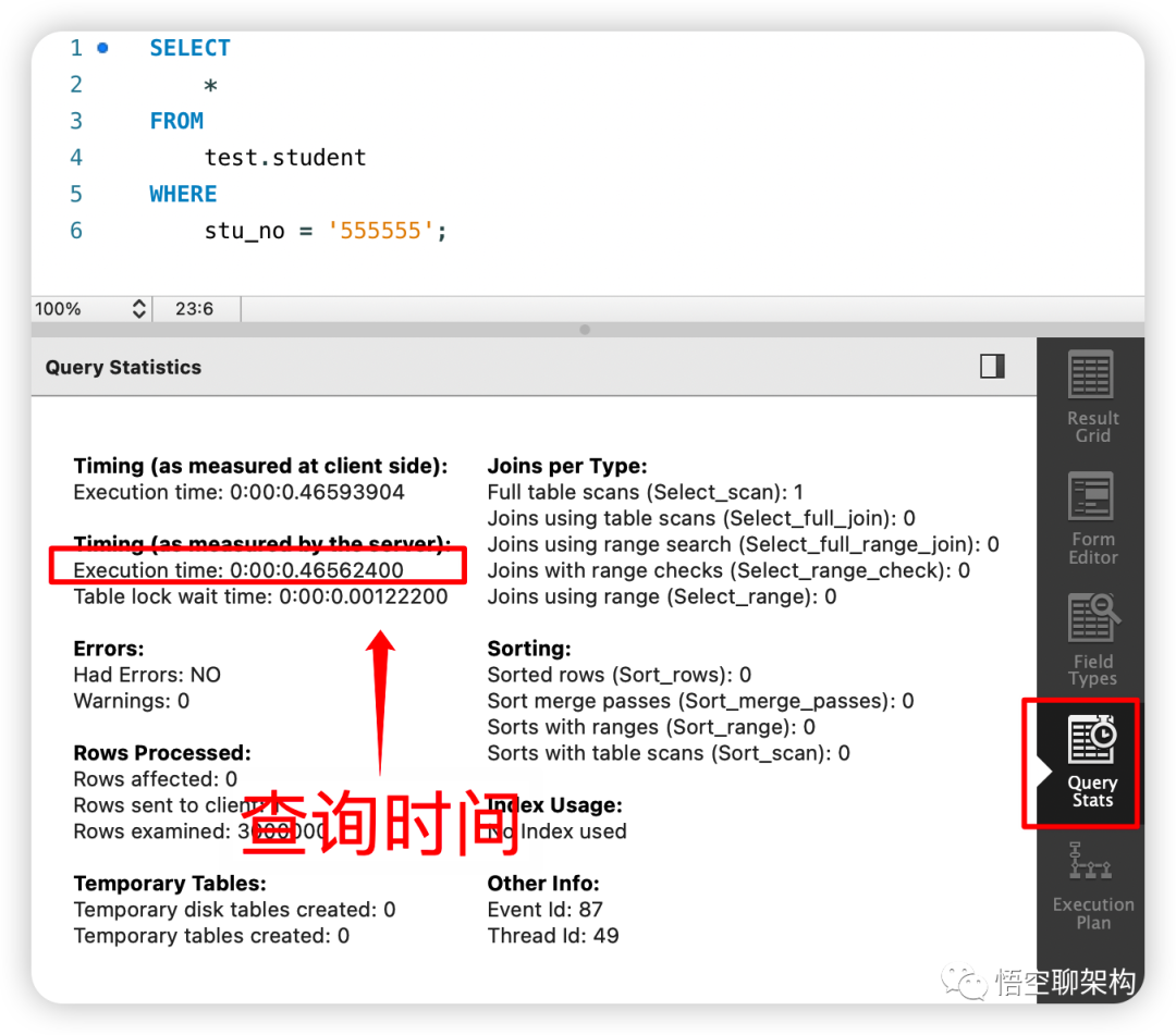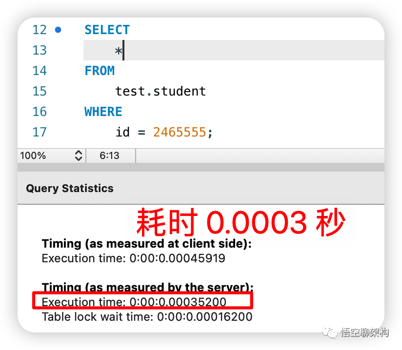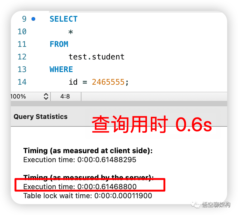 我们之前创建 student 表的同时添加了以 id 为索引字段的主键索引(聚簇索引),所以看下使用主键 id 来查询的速度怎么样。如果你之前对这个表没有添加过主键索引,可以通过这个脚本添加: