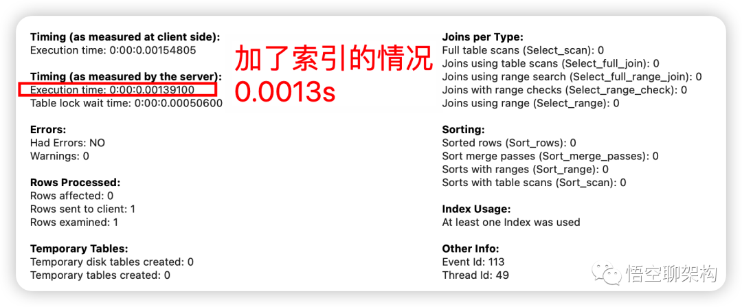 加了索引后,查询只需要 0.0013s,如下图所示:
