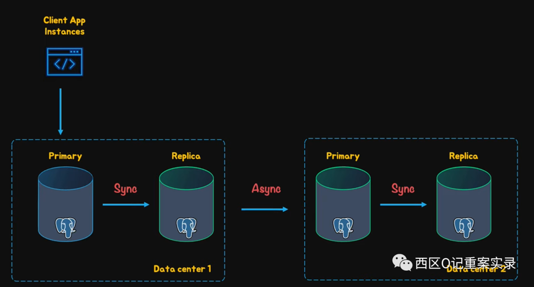 如下图,可以为同一个机房的主从设置为同步模式,来避免存储级的故障,跨机房则采用异步模式。这个和Oracle DG的设计思路是一样的。