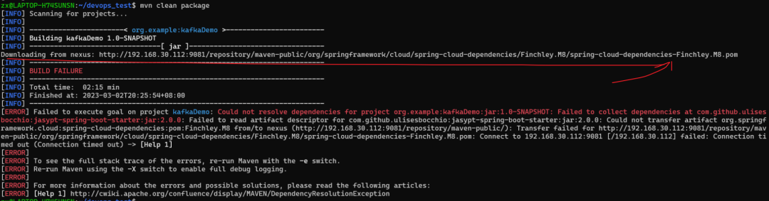 而再次将maven的settings.xml恢复私服仓库的镜像配置,执行mvn clean install失败,上报了一样的依赖错误。