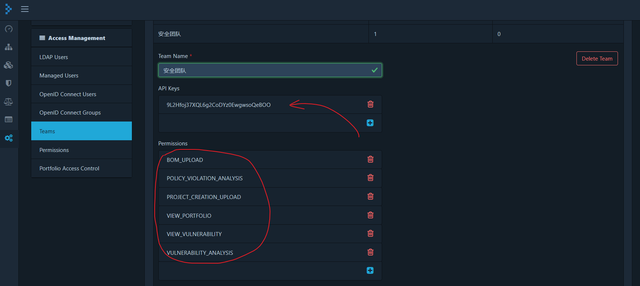 Access Management选项创建团队,dependency track的定位是为组织的安全团队使用,为团队增加BOM_UPLOAD、POLICY_VIOLATION_ANALYSIS、PROJECT_CREATION_UPLOAD、VIEW_PORTFOLIO、VIEW_VULNERABILITY、VULNERABILITY_ANALYSIS权限,复制API Keys作为后续认证令牌。