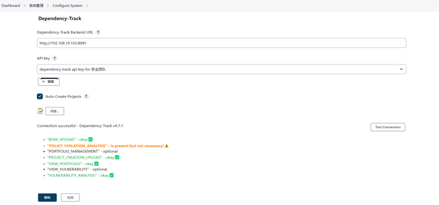 为了为Dependency Track提供SBOM以进行漏洞分析,使用jenkins作为CI/CD的话建议使用Dependency-Track插件。一旦插件安装成功且生效后,就可以在系统配置中看到Dependency-Track的配置项,输入后端URL地址和上面团队的API Keys,如果连接测试成功,就会显示出如下成功信息。