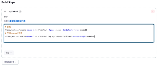创建jenkins项目,构建步骤执行打包和生成SBOM执行