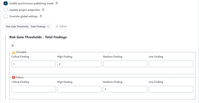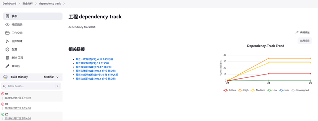 如果不勾选,项目构建完成后,直接访问dependency track前端查看分析结果;如果勾选,项目构建完成后,会等待dependency track分析完成后,调用api读取分析结果,并可以在jenkins构建信息中查看。同时,可以设置各级别等级漏洞的门限值,以此判定构建是否成功。