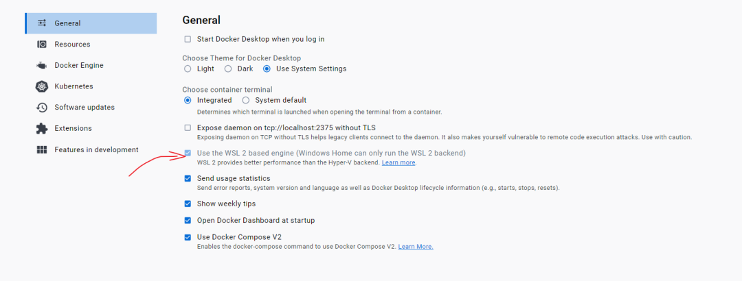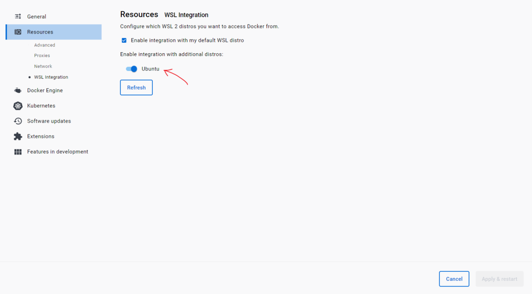 Resources > WSL integration中勾选安装的Linux发行版Ubuntu,应用并重启