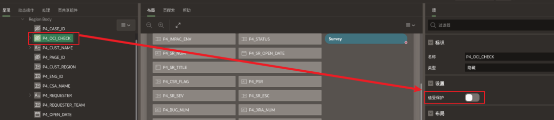 第一步:创建一个隐含项P4_OCI_CHECK。这里要注意的是:必须要在项属性里把“值受保护”这个开关关掉,否则点击按钮提交事务的时候会报错。