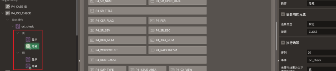 第三步:回到P4_OCI_CHECK。针对这个隐藏项做一个DA。如果P4_OCI_CHECK=“OCI”为真,则显示“Close OCI”。否则,显示“Close”。