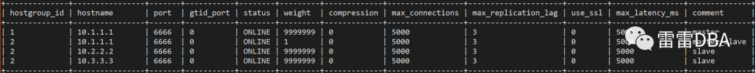 为防止ProxySQL在所有从实例宕掉无法查询数据库的问题,需要将主实例添加至当前mysql_servers的组2 ,改权重为1,其他权重为 9999999,可以解决此问题。