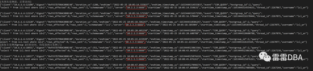 for i in {1..1000};do mysql -ulcl_wr -pxxx -h中间件IP -P6666 -e "select * from lcl.test where id=2";sleep 2;done