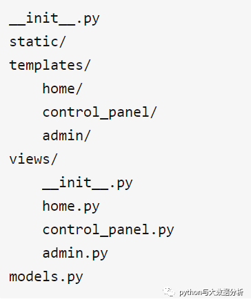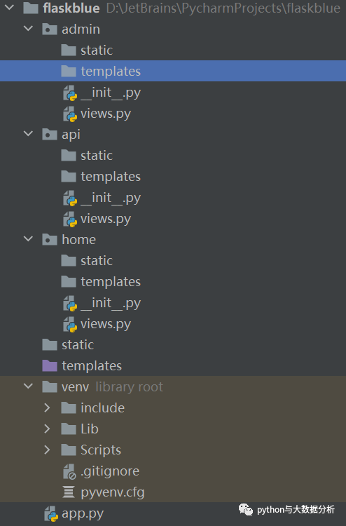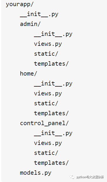 分区式架构,适用于子模块有特殊需要的情况,在创建蓝图构造Blueprint对象时,可以指定static和templates, 其结构类似于下面这样