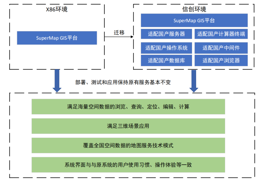 SuperMap GIS 平台系统满足不动产及自然资源确权核心业务系统在 X86 环境与信创环境双轨混搭模式逐步向完全信创环境过渡的要求。