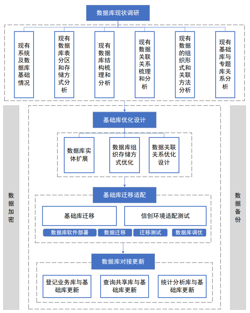 数据库适配迁移总体任务包括数据库优化、数据库迁移适配、建立数据库更新机制、做好数据加密和备份等任务。自然资源确权登记数据因在建设初期就确定存储在国产瀚高数据库中,本次数据库迁移不涉及自然资源确权登记数据,仅迁移存储在 Oracle 数据库中的不动产登记数据。遵循新《不动产登记数据库标准》,进行业务系统基础库、业务库、查询共享库、统计分析库库表结构,对接关联关系的扩展优化,保证各库表满足数据库标准,保证各数据的一致性、标准性。
