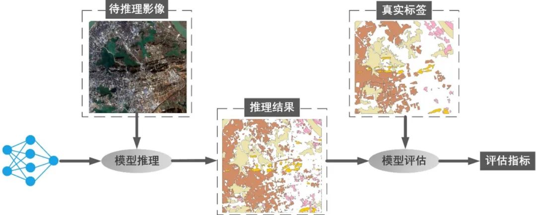 模型评估就是这样一个定量化描述模型表现的工具,它通过对比模型推理的结果和真实地物信息,计算一系列评估指标来验证模型效果。一方面,基于相同的推理数据和详细的评估指标,模型评估可比较多个模型的应用效果;另一方面,模型评估结果通常包含总体和子类的多种评估指标,能够快速发现在训练过程中可能出现的问题并辅助训练人员针对性地对模型进行优化。