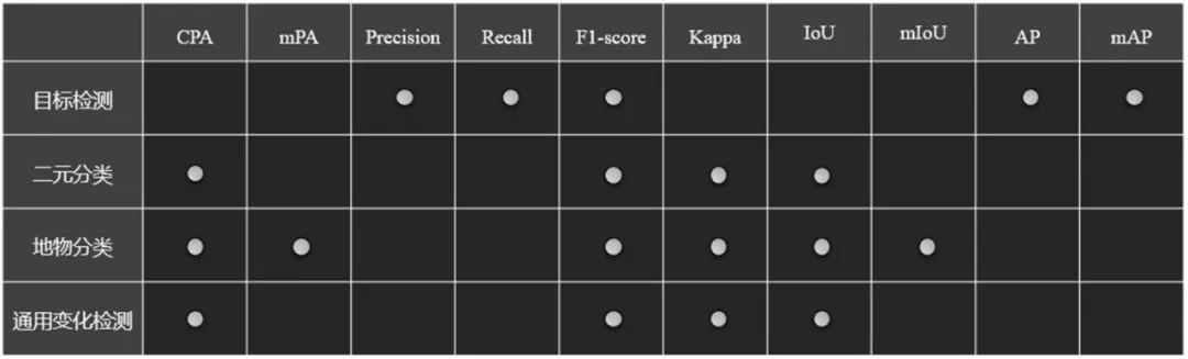 SuperMap模型评估工具针对影像目标检测、二元分类、地物分类和通用变化检测模型提供了不同的评估指标,如下图所示: