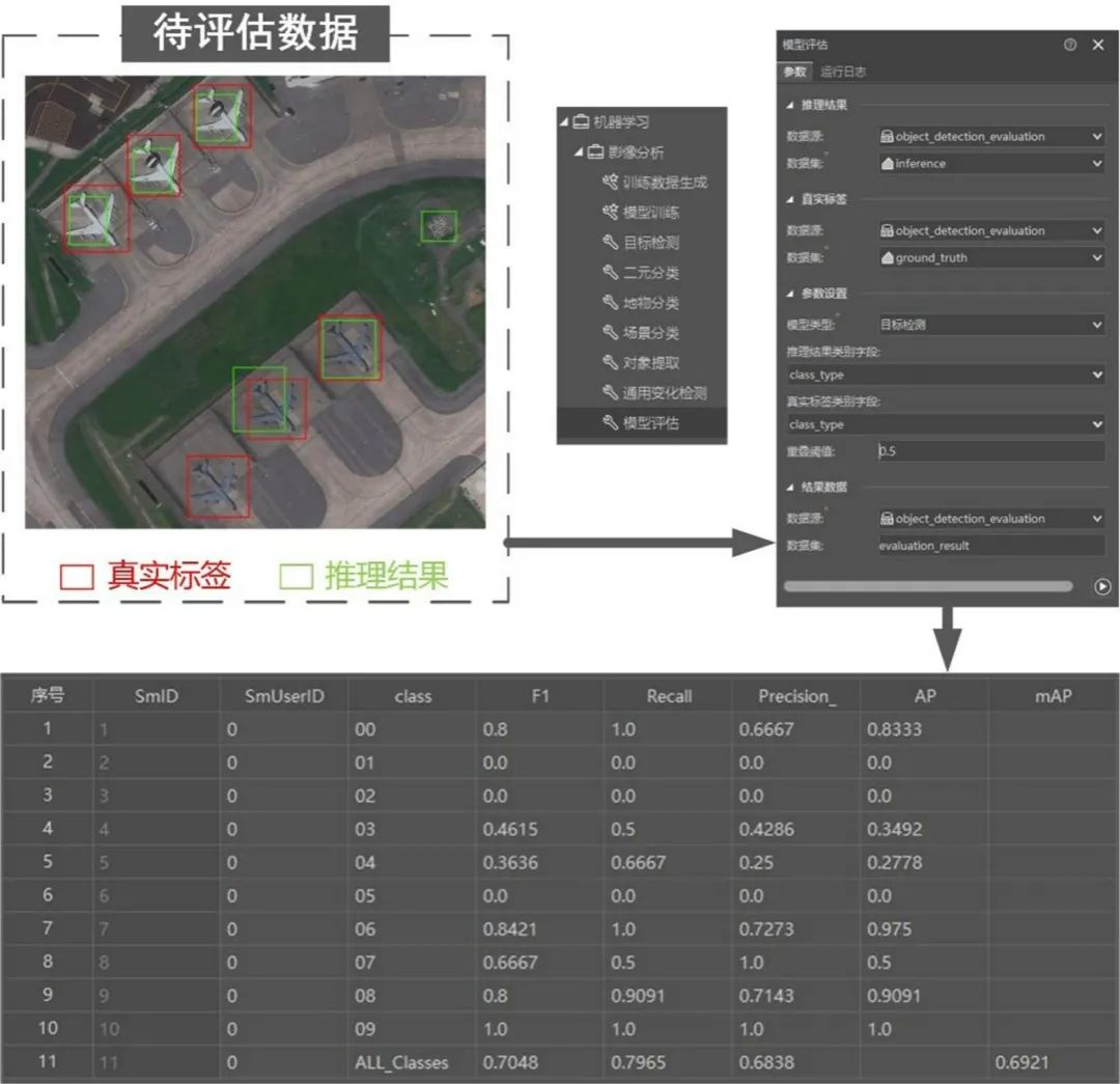 此外,SuperMap“一键式”的模型评估工具方便快捷,用户只需要输入推理结果与真实标签,选择模型类型,即可得到全面详细的评估指标表,方便用户对模型效果进行多维度的判断和分析。下图以目标检测为例,展示了如何使用SuperMap桌面软件的模型评估工具。