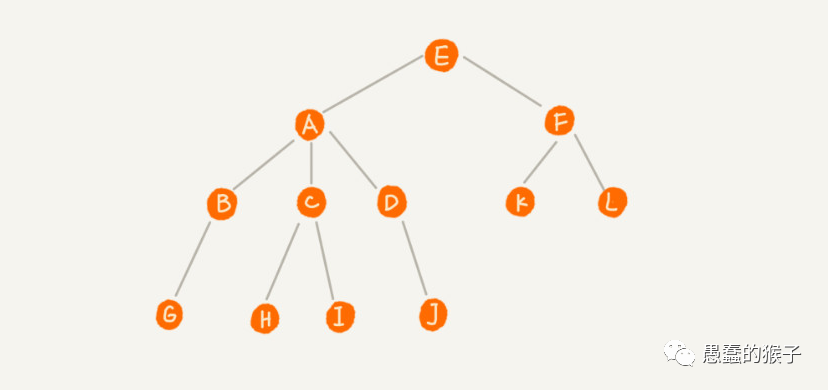 下图就是一个典型的树结构,A 节点就是 B 节点的父节点,B 节点是 A 节点的子节点。B、C、D 这三个节点的父节点是同一个节点,所以它们之间互称为兄弟节点。我们把没有父节点的节点叫做根节点,也就是图中的节点 E。我们把没有子节点的节点叫做叶子节点或者叶节点,比如图中的 G、H、I、J、K、L 都是叶子节点。
