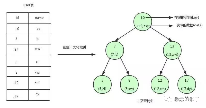 解析:我们为user 表建立一个二叉树索引,索引中的key对应user 表中的id, value 对应user 表中对应的数据。这个时候如果我们要查找一个id=12 的数据,我们从根节点开始,仅需要三次搜索就可以拿到我们想要的数据。