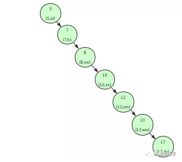 但是在某些情况,二叉树会出现链表结构(如图)。这个时候如果我们要查找一个id=12 的数据,需要查询5次。这个时候我们就需要用到平衡二叉树。