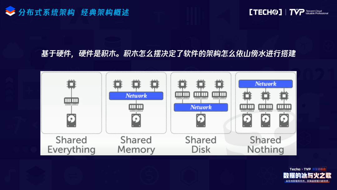 先来看第一部分,分布式数据库的发展演进。这幅图在说明什么?里面在谈一些基础架构:Shared Nothing、Shared Memory、Shared Disk、Shared Everything。这些是什么?最早从哪里来?硬件层面是做软件的基础,硬件层面的发展决定着软件技术的发展,硬件层面把一些基本的框架搭好后,数据库的软件或者说应用层、系统层的软件都会在上面叠加,就像搭积木一样,一块一块地往上垒。对于数据库内部其实也是这样的,分模块、分层次,之后这些东西都可以搭建在一起。但是数据库有着紧耦合性较强的特点,搭在一起后就很难拆开,但是现在做分布式数据库的一个趋势是要尝试把这些东西拆分,再像搭积木一样往上垒,哪个地方需要什么样的组件,就去建设这样的组件,模块与模块之间要解耦,解耦之后更易搭建,把这个系统搭得在将来更具扩展性。分布式数据库系统的底层基础是和硬件紧密相关的。