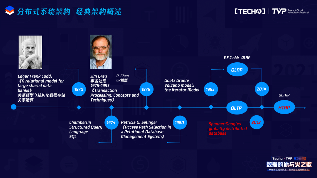 我从技术的角度展示一下数据库的代表技术。在这幅图中,第一个人是数据库界图灵奖的第二位得主——关系模型的创始人科德博士,他在1970年的时候以一篇论文奠定了关系型数据库的基础。1974年时有两个典型的技术诞生,一个是SQL语言,另外一个是事务处理技术。50多年前,数据库界第三位图灵奖得主James Gray开始研究事务处理,并对得到了一系列的开创性的成果,所以事务处理奠基于70年代,直至今日。同年,IBM同样诞生了一个开创性的技术,就是我们所熟知的SQL,SQL这个概念是从IBM在做数据库的研究起就开始提出的结构化查询语言。